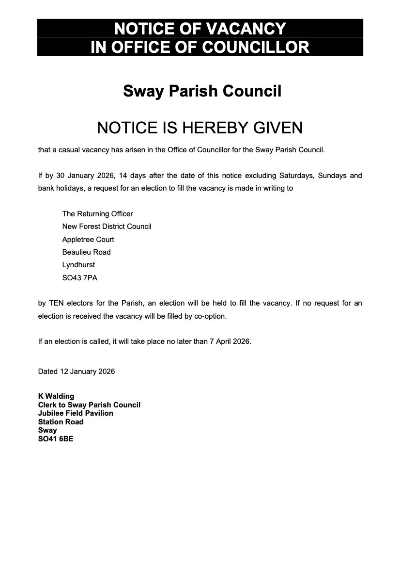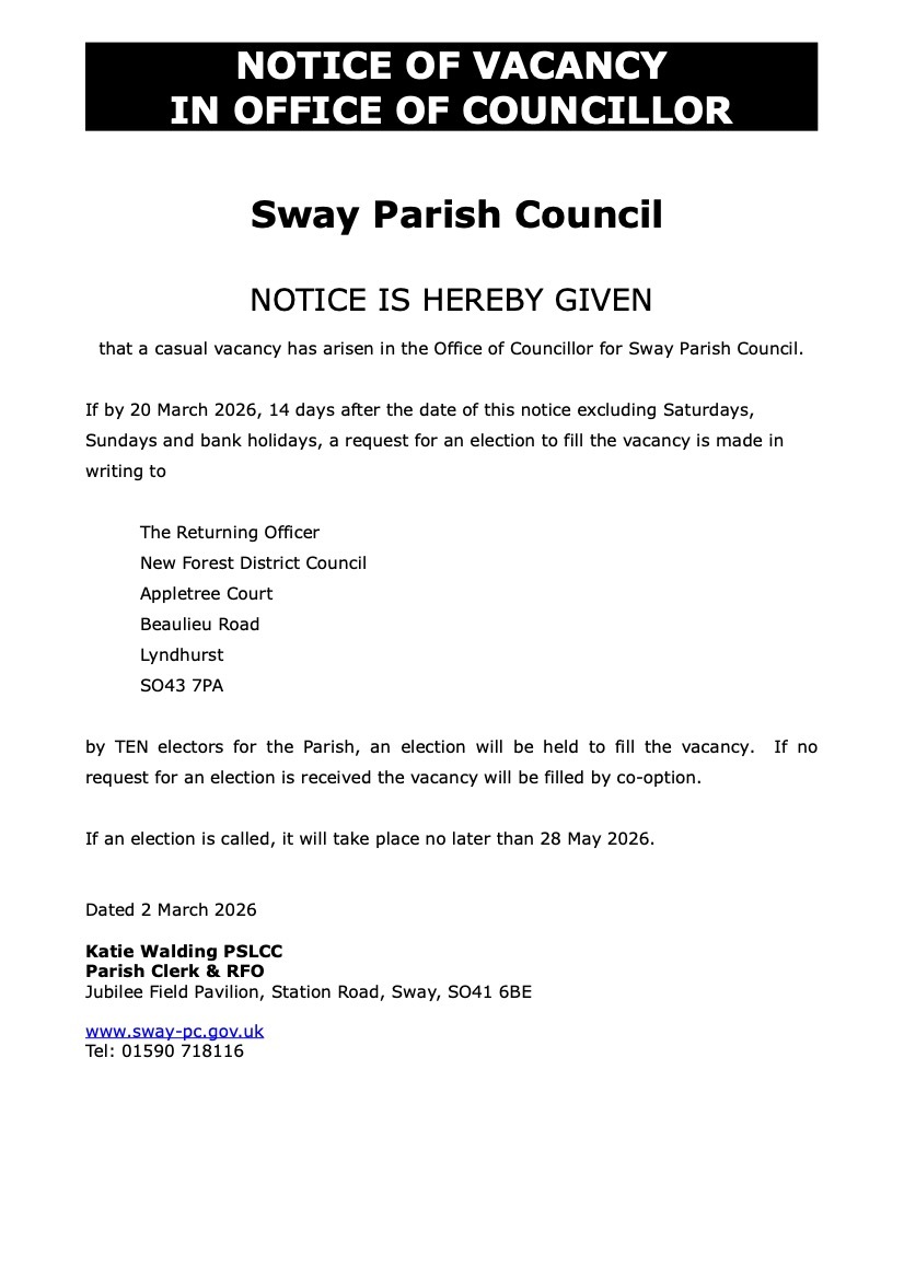 A casual vacancy has arisen in the Office of Councillor for Sway Parish Council. Click to see notice.